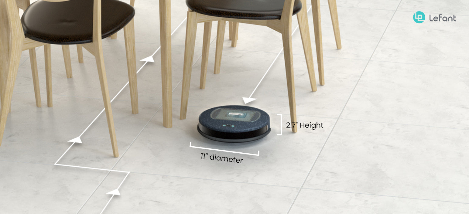 With a height of only 2.7 inches, it will easily fit under most pieces of furniture. Using the drop-sensing technology, it will be prevented from falling down the stairwell (or any other heights). It is also self-charging, so it will return to its station without the need for human intervention.